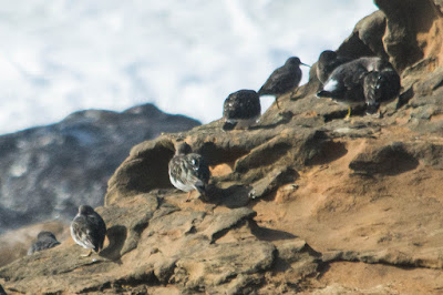 The folks around us at Devil's Punchbowl were curious as to why we were exchanging high fives within out first thirty seconds of arriving. Rock Sandpipers are always a cause for celebration, particularly when they are the drive up variety. They can be quite tricky to track down, so we were quite relieved to see these two nestled in among a flock of Black Turnstones and Surfbirds. All three species are pictured here, poorly:
